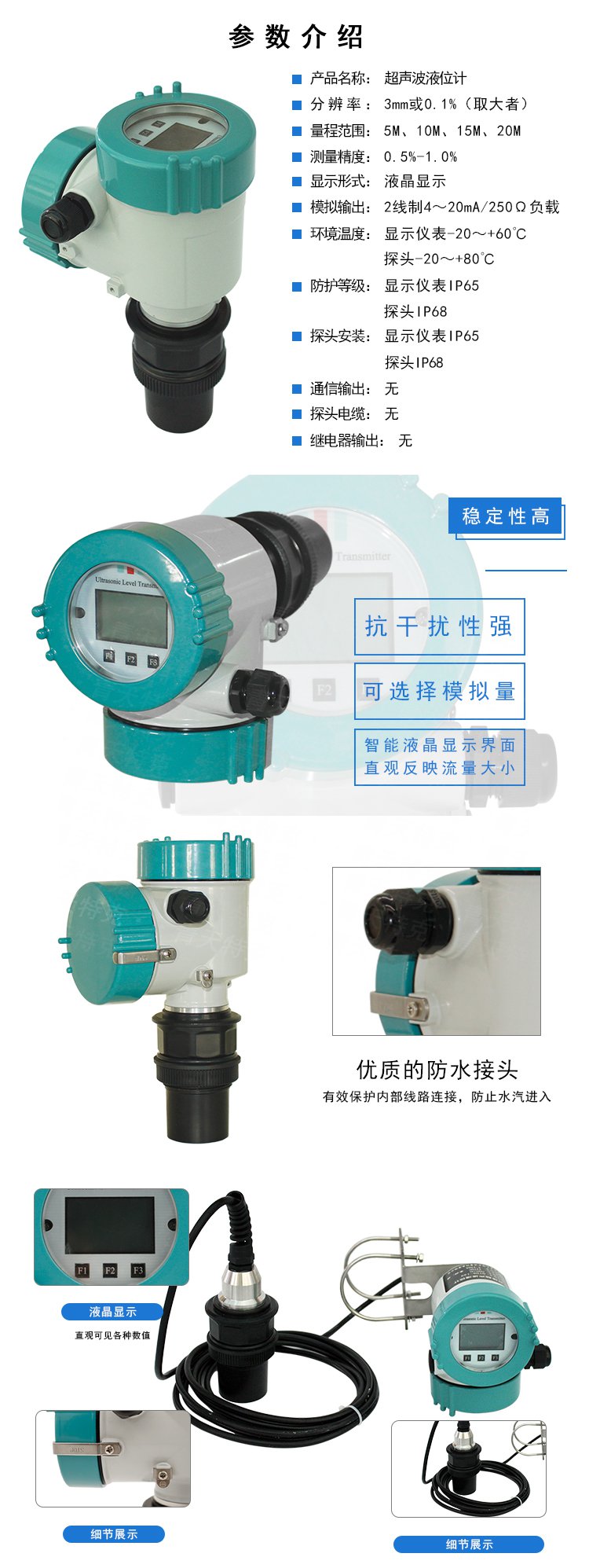 5、多種輸出形式:可編程繼電器輸出、高精度4-20mA電流輸出、Rs-485數(shù)字通信輸出分體超聲波液位探頭。