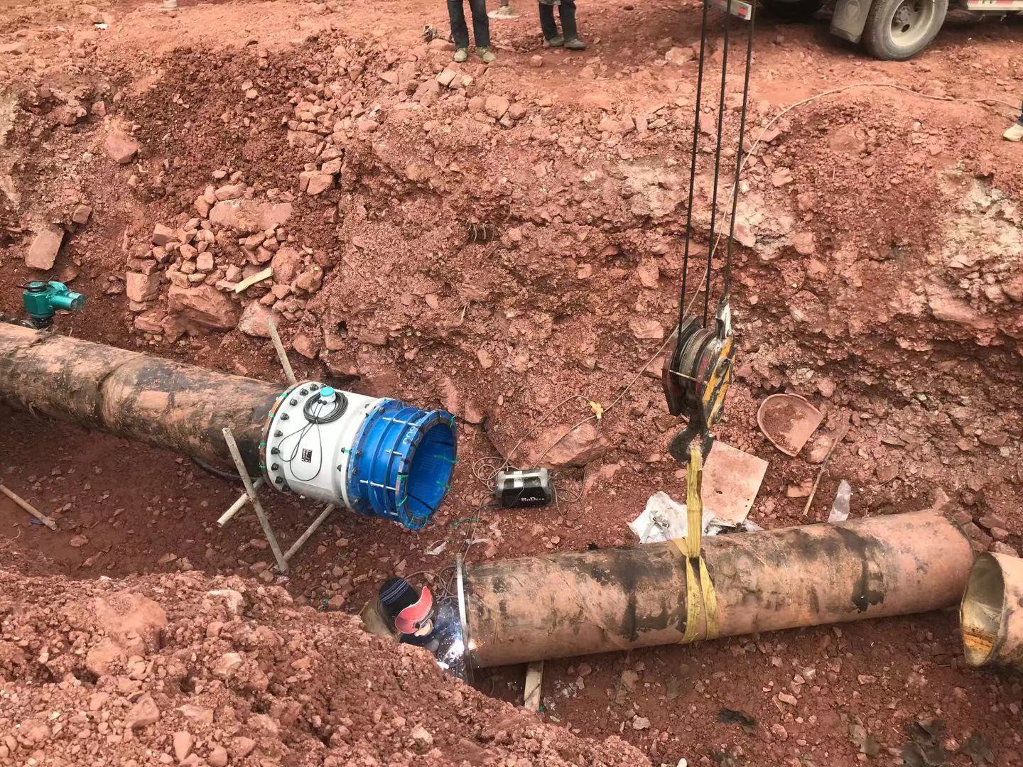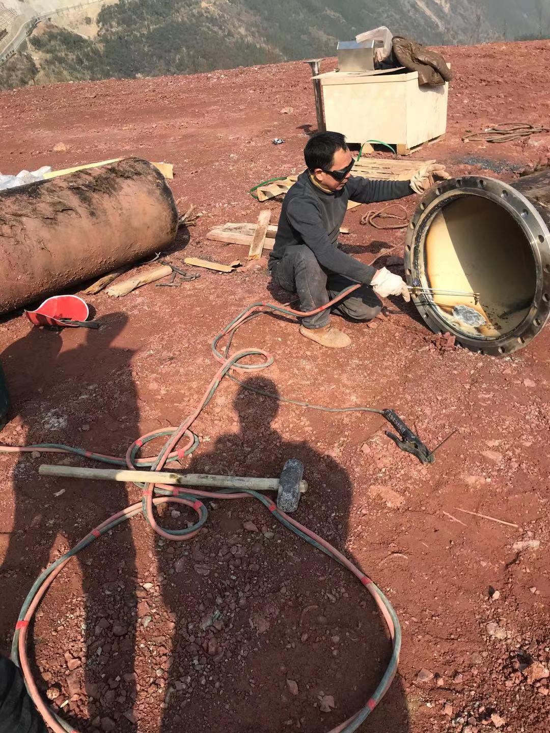現場工作人員正在切割管道和焊接法蘭。